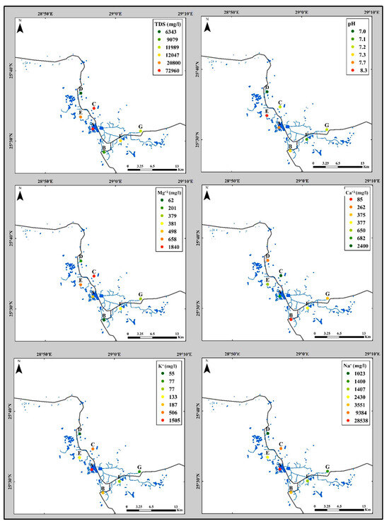 The spatial distribution of the TDS, pH, Ca+2, Mg+2, Na+, and K+ in the wastewater.