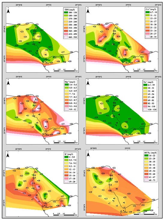 The spatial distribution of the TDS, Ca+2, Mg+2, Na+, K+, and HCO3− in the groundwater samples.