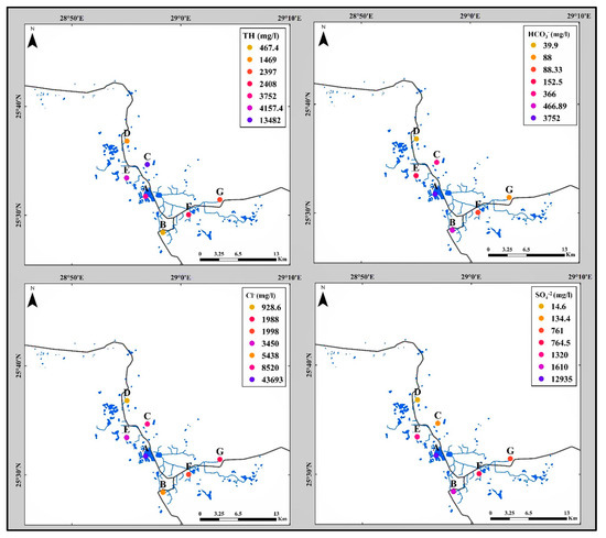 The spatial distribution of the TH, HCO3−, Cl−, and SO4−2 in the wastewater.