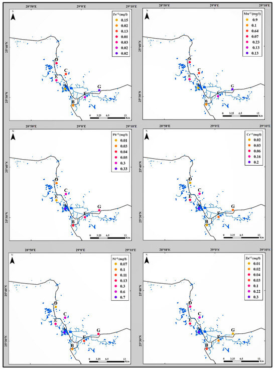 Some trace elements, such as Fe+2, Mn+2 Ni+2, and Pb+2, are measured in some water points in the study area. The distributions of the trace elements in the groundwater and wastewater in the study area are shown in Figure 6 and Figure 9.