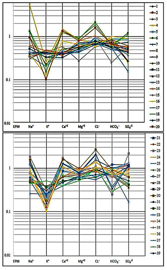 The Schoeller semi-logarithmic diagram was created using the Excel software program (2016); the analysis results are plotted on the Schoeller diagram [55]. This diagram can be used to represent an analysis by connecting points related to gravimetric concentrations. Logarithmic scales are used to express concentration values. The plotting of data on a diagram of this type may be helpful in comparative analysis of the major ions; in particular, for water samples that are high in this diagram (Figure 11 and Figure 12), it is clear that Na+ > Cl− > Ca+2 >SO4−2 > HCO3− > Mg+2 > K+. Analyses of the chemical composition of the water samples are plotted in equivalents per million (meq/L). According to the Schoeller diagram, the general patterns in the samples were HCO3− > Cl− > SO4−2 > Na+ > Ca+2 > K+ > Mg+2, while in the wastewater samples they were Cl− > Na+ > SO4−2 > HCO3− > Ca+2 > Mg+2 > K+.