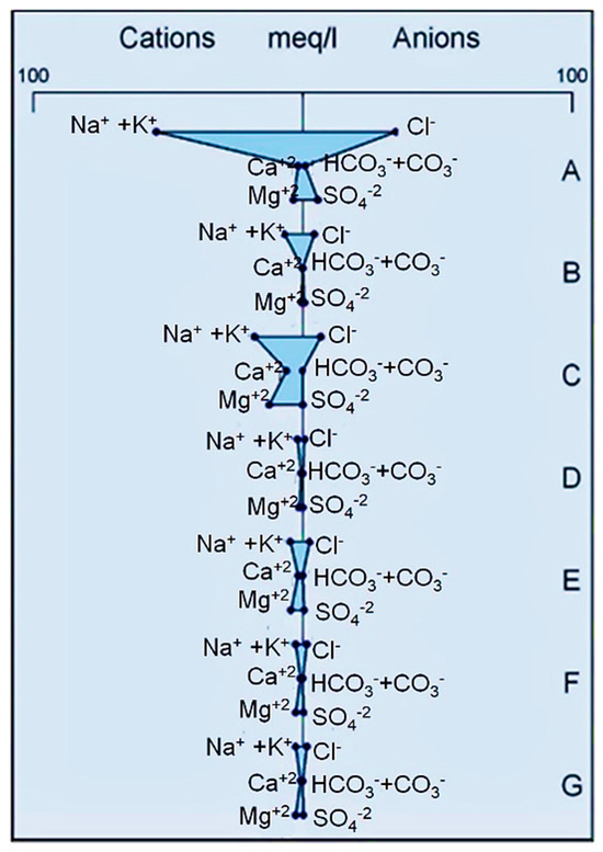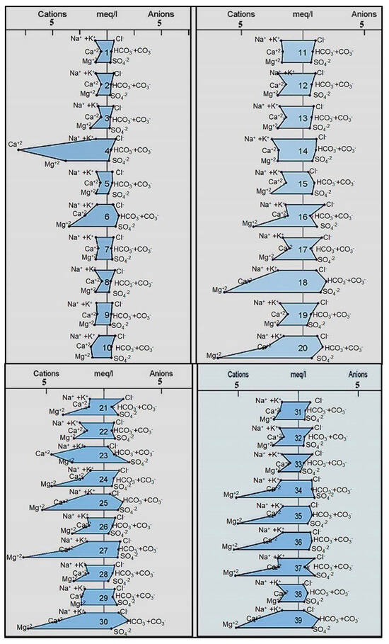 Stiff Jr. [57] developed a graph to represent the chemical analysis called the Stiff diagram. It is widely used to display the major ion content in water samples. The diagram has a polygonal shape (four parallel horizontal axes extending on either side of a vertical zero axis). Major ions (meq/L) and anions are plotted on the right, while cations are plotted on the left of the zero axis. A Stiff diagram can be used to compare water from different sources and can be used to visualize ionic-related water bodies in order to determine their flow paths, or to show how the ionic composition of a water body changes over time. The plotted points yield a pattern with the shape characteristics of the composition of the representative sample. The analysis generates polygons that highlight similarities or differences in overall water chemistry. The width of each polygon serves as an approximate representation of the total ionic content.