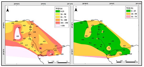 The values of WQI with iron and manganese concentrations for the groundwater samples in the study area (Table 8) and the spatial distribution map of WQI with iron and manganese (Figure 15a) show, for two samples (5%), the WQI values are between 26 and 50, and are acceptable for domestic, irrigation, and industrial uses (good). Fifteen samples (38.5%) were impure, with WQI 51–75, and are acceptable for irrigation and industrial uses (poor), and twelve of the samples (30.8%), with WQI 76–100, are acceptable for irrigation (very poor). A WQI between 101 and 150 was found in four of the samples (10.3%), which restricted their use for irrigation (unsuitable), and a WQI of more than 150 was found in six of the samples (15.4%), for which proper treatment is required before any use (unfit for drinking). The values of WQI without iron and manganese parameters in the groundwater samples in the study area (Table 8), and the spatial distribution map of WQI without iron and manganese parameters (Figure 15b), refer to twenty-six samples (66.6%), for which the WQI values are between 0.0 and 25 and are acceptable for drinking, irrigation, and industrial uses (excellent), and represent most of the study area. Twelve samples (30.8%) were impure, with WQI 26–50, and are acceptable for domestic, irrigation, and industrial uses (good), and one sample (2.6%), with WQI 51–75, is acceptable for irrigation and industrial uses (poor). The values of the WQI in the wastewater samples in the study area are more than 150 (Table 9), so this water needs proper treatment before any use.
