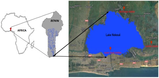 - Mama, D.; Deluchat, V.; Bowen, J.; Chouti, W.; Yao, B.; Gnon, B.; Baudu, M. Caractérisation d’un Système Lagunaire en Zone Tropicale: Cas du lac Nokoué (Bénin). Eur. J. Sci. Res. 2011, 56, 516–528. [Google Scholar]