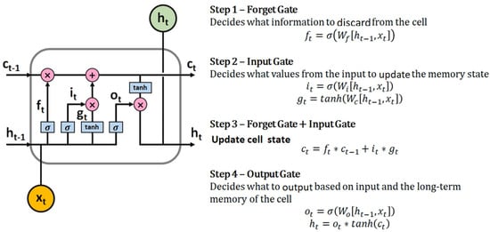The Long Short-Term Memory (LSTM) cell is an enhancement of the optimization proposed in [32]. Considered a black box, the LSTM cell, widely used in time series forecasting, is an impressive architecture of an artificial recurrent neural network (RNN) capable of memorizing the temporal order of data. Furthermore, the LSTM overcomes the issues of gradient instability and insufficient memory capacity through the state of its cells and gates [33]. The two main problems of the RNN architecture are gradient instability and its inability to retain information from long sequences of temporal data. In contrast, the LSTM cell, as a deep learning predictive model, receives the latent states from the previous step and has a self-evaluation mechanism that offers better performance in time series forecasting. The internal structure of the LSTM consists of three main gates that control the flow of information: (i) forgetting unwanted information in the current cell state through the forget gate (ft), (ii) adding additional data to the current cell state through the input gate, also known as the temporal attention module (It), and (iii) producing an output from the current cell state through the output gate (Ot). These gates serve specific operations on the cell states. The state of the LSTM network is divided into two states: ht and ct. The hidden state ht of the LSTM network is considered as short-term memory, while the cell state ct is considered as long-term memory of the network. The operations performed within the LSTM cells help the model retain information from sequential data. The LSTM network uses cells as memory units for the model. The gates, as shown in Figure 2 and illustrated in Equations (1) and (4)–(6), determine the data to be carried.