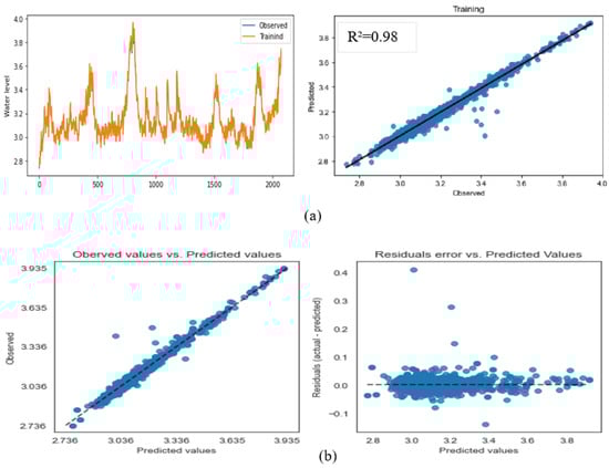 (a) Comparison between observed water levels and water levels predicted by the LSTM model during the calibration phase; (b) correlation and residual error during the calibration phase.