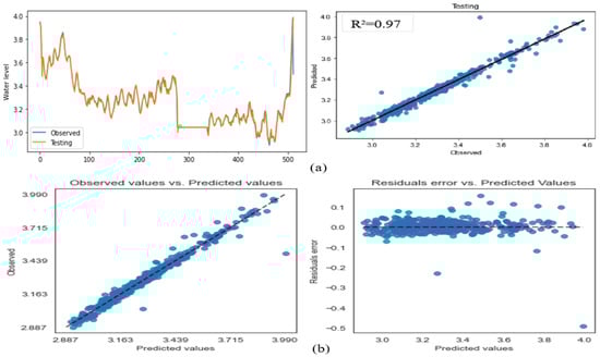 The adaptability of LSTM to the Lake Nokoué basin during the calibration and validation periods is also supported by the convergence of the loss function evolution during both phases, as shown in Figure 5. Correspondingly, the results from Ling et al. [39] showed that the method proposed in this article was more effective than other methods of artificial recurrent neural networks. The loss function values decrease with the number of iterations, stabilizing below 0.1, indicating maximum optimization of the model’s performance during the calibration and validation phases. Given the architecture of the LSTM model, it was noted in the study by Hu et al. [40] a tendency of the LSTM model towards a local optimum. The hydrographs of observed and predicted water levels by the LSTM model during the calibration and validation phases are depicted in Figure 6a,b. It is evident that the observed and predicted floods and recessions are nearly identical. This synchronization between observed and estimated floods demonstrates the LSTM model’s ability to reproduce critical water levels that could lead to flooding. Recently, a number of existing literature studies have considered the classification of streamflow forecasting using recurrent neural network models. Thapa et al. [41] developed a deep learning long-short-term memory (LSTM)-based model in the Himalayan basin for snowmelt-based discharge modeling. Ni et al. [42] applied the deep learning method for daily flow simulation and used data from previous years for flow forecasting. The model was carried out according to several perspectives. At the end of the study, it was found that the LSTM model was advantageous in processing constant flow data in the dry season and gave satisfying results in capturing data features in rapidly fluctuating flow data in rainy seasons. Luo et al. [43] built a new hybrid model based on the long-short-term memory approach for predicting streamflow. In this study, the linear regression model, which is one of the classical methods, was used to show how successful the performance between the benchmark model and the hybrid model was. The satisfactory forecasting results are further evident in Figure 7a,b and Figure 8a,b, which present scatter plots of predicted (estimated) water levels against observed water levels. The linear trend line of the scatter plots during the training (calibration) and testing (validation) phases highlights the strong correlation between observed and predicted water levels, with a correlation coefficient of 0.98 during calibration and 0.97 during validation (Table 2). This linear alignment, particularly for water levels between 3.5 m and 3.9 m, indicates that the LSTM model accurately predicts extreme water levels in Lake Nokoué that could lead to flooding. Figure 7b and Figure 8b illustrate a good distribution of the LSTM model’s residual errors, with values ranging from −0.1 to 0.4 during the training phase and −0.5 to 0.1 during the testing phase. Negative residual errors indicate an overestimation of water levels, while positive residual errors indicate an underestimation of water levels in Lake Nokoué by the LSTM model. These underestimations and overestimations remain acceptable for predicting extreme water levels in Lake Nokoué.