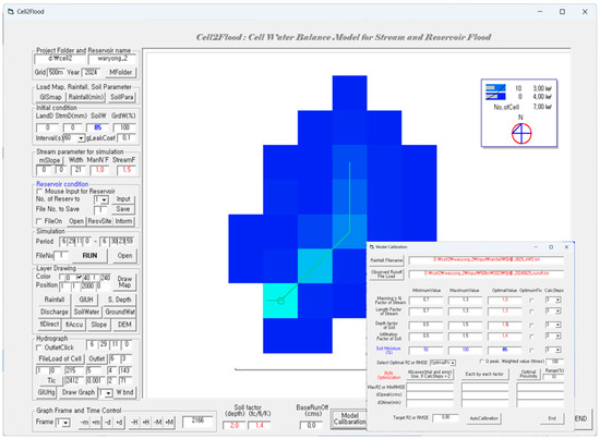 Cell2Flood simulates rainfall–runoff hydrologic flow on a three-layer conceptualization, surface flow, interflow, and groundwater, on a grid basis. Surface flow and interflow are modeled to occur in specific flow directions, whereas groundwater outflow can occur in all directions and is governed by a two-dimensional groundwater flow equation. The model functions independently of a Geographic Information System (GIS) engine, employing the ASCII format for all spatial input and output data. As shown in Figure 2, Cell2Flood provides a graphical user interface and incorporates an auto-calibration module developed using Visual Basic. Further developmental efforts are underway to create cloud-based web interfaces that enhance accessibility and functionality [20].