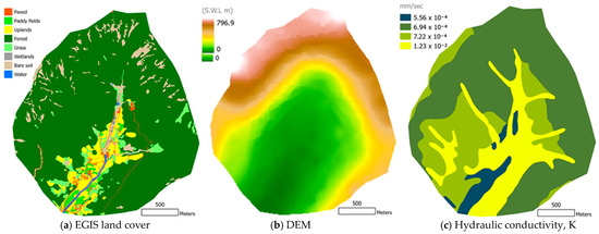 The model utilizes a suite of geospatial raster data, including a land cover map, detailed soil map, Digital Elevation Model (DEM), flow direction map, and flow accumulation map, including 10-min interval rainfall data stored in a text file. In this study, the land-cover map used was Level-2, which categorized land-cover features from the Environmental GIS (EGIS) of the South Korean Ministry of Environment [28]. Soil properties were derived from detailed soil maps (1:25,000 scale) of the National Institute of Agricultural Sciences (NAS) in South Korea, employing parameters such as effective soil depth, hydraulic conductivity, initial infiltration rate, and steady-state infiltration rate by soil texture to determine rainfall infiltration and soil moisture dynamics [29]. All data were resampled to a common 500 m spatial resolution and converted to an ASCII format (Figure 3). During data loading, the rainfall data in the text file were automatically parsed and transformed into an ASCII grid at 10-min intervals coinciding with the spatial extent of the other raster layers. The study area encompassed 30 valid data cells within an 8-row by 6-column grid, defined by the basin boundary and excluding any Null cells.