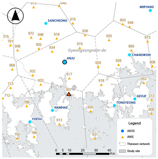 To assess the applicability of the rainfall input data to the Cell2Flood model in ungauged basins with limited hydrometric data, six distinct types of rainfall datasets, including on-site measurements, were generated for the model input. Initially, point-gauged rainfall data were collected from three sources, the sole on-site AWS within the target basin, the nearest AWS (Samcheonpo/907), and the governing ASOS station (Jinju/192), as determined using the Thiessen network method (Figure 4). Furthermore, three types of gridded rainfall data were generated: one interpolated from 39 ASOS stations surrounding the target area, another from 117 AWS stations, and the third based on Hybrid Surface Rainfall (HSR) radar data provided by the KMA. For spatial interpolation, inverse distance weighting (IDW), commonly adopted in hydrological studies [30], was applied at a spatial resolution of 500 m to align with the HSR data. Each dataset was maintained at a temporal resolution of 10 minutes. The HSR dataset was calibrated using KMA to account for the topographic complexity of the Korean Peninsula. The dataset was generated by synthesizing radar observations from 14 large dual-polarization radar stations, including a radar testbed dedicated to technological development, and was provided at temporal intervals as short as 5 min.