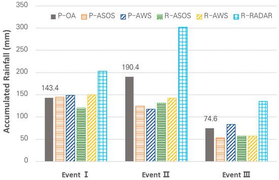 A comparative analysis of the accumulated rainfall across the six selected datasets was conducted to evaluate the uncertainty inherent in the rainfall inputs for hydrological modeling (Figure 5). At the basin observation point (P-OA), Event II, influenced by Typhoon Khanun, recorded the highest total rainfall at 190.4 mm, whereas Event III registered the lowest at 74.6 mm. Notably, across all three events, the point-gauged rainfall data (P-AWS) from the nearby Samcheonpo AWS and the basin-averaged rainfall (R-AWS) derived from the gridded dataset interpolating both the ASOS and AWS stations exhibited the closest alignment with the onsite AWS observations (P-OA). In Event II, wherein P-OA observed the highest rainfall, all datasets except the HSR radar-derived data (R-RADAR) underestimated the observed totals, with the most pronounced discrepancy occurring between P-OA and the other datasets. In contrast, R-RADAR consistently overestimated the accumulated rainfall across all events, particularly in Event III, where it reported 128.8 mm—approximately 1.7 times the value observed at P-OA (74.0 mm). Although the point-gauged P-AWS data and gridded R-AWS dataset appeared to be the most reliable inputs for modeling based on accumulated rainfall alone, the substantial variability observed between events underscored the need for a thorough examination of the spatiotemporal dynamics of rainfall across the study area.
