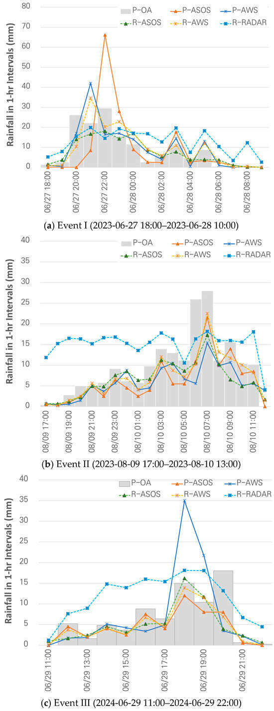 The hourly rainfall variation analysis for each event revealed different temporal distributions across rainfall inputs. In Event I, the point-gauged data from the P-AWS and the basin-averaged rainfall from the gridded R-ASOS dataset, which interpolated only the ASOS stations, showed the closest match with the on-site AWS observations (P-OA) (Figure 6a). P-OA and P-ASOS recorded peak rainfall simultaneously, whereas all other datasets recorded the peak 1 h earlier, between 22:00 and 23:00 on 27 June 2023. For Event II, as shown in Figure 6b, all rainfall datasets except the radar-based rainfall (R-RADAR), which exhibited minimal temporal variation, recorded a peak simultaneously between 07:00 and 08:00 on 10 August 2023, consistent with that of the P-OA. However, the maximum hourly rainfall across all rainfall inputs was lower than that of the P-OA. In Event III, all rainfall inputs, except P-OA, recorded a peak between 18:00 and 19:00 on 29 June 2024, 2 h earlier than P-OA (Figure 6c). Notably, despite its proximity to the study basin, P-AWS recorded a maximum hourly rainfall approximately 1.9 times higher than that of P-OA, suggesting substantial spatial inhomogeneity within the basin.