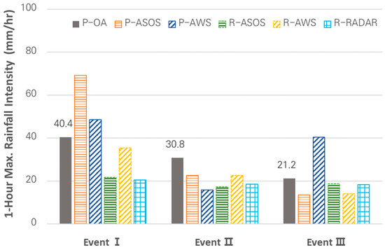Comparison of 1 h maximum rainfall intensity for each rainfall input by events.