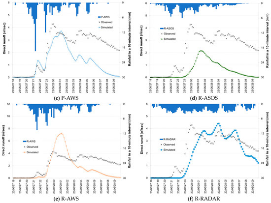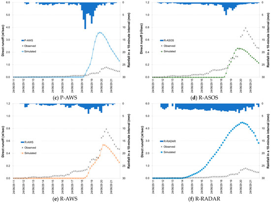 In Event II (Figure 10), all rainfall datasets, except R-RADAR, showed temporal patterns that corresponded well with the observed data but produced significantly lower simulated runoff than the actual measurements. This underestimation was likely due to the lower cumulative rainfall and reduced peak intensity compared with those of P-OA. Similar reasoning explained the underpredicted runoff observed in Figure 9d in the R-ASOS dataset, which showed diminished rainfall characteristics. For R-RADAR during Event II, the rainfall variation exhibited an anomalously steady intensity from the onset, unlike other datasets, including P-OA, which featured an initial period of low rainfall followed by a later increase (Figure 10f). The runoff simulated with R-RADAR increased earlier than the observed runoff and deviated substantially, reflecting a distinct temporal response pattern that did not align with on-site measurements.