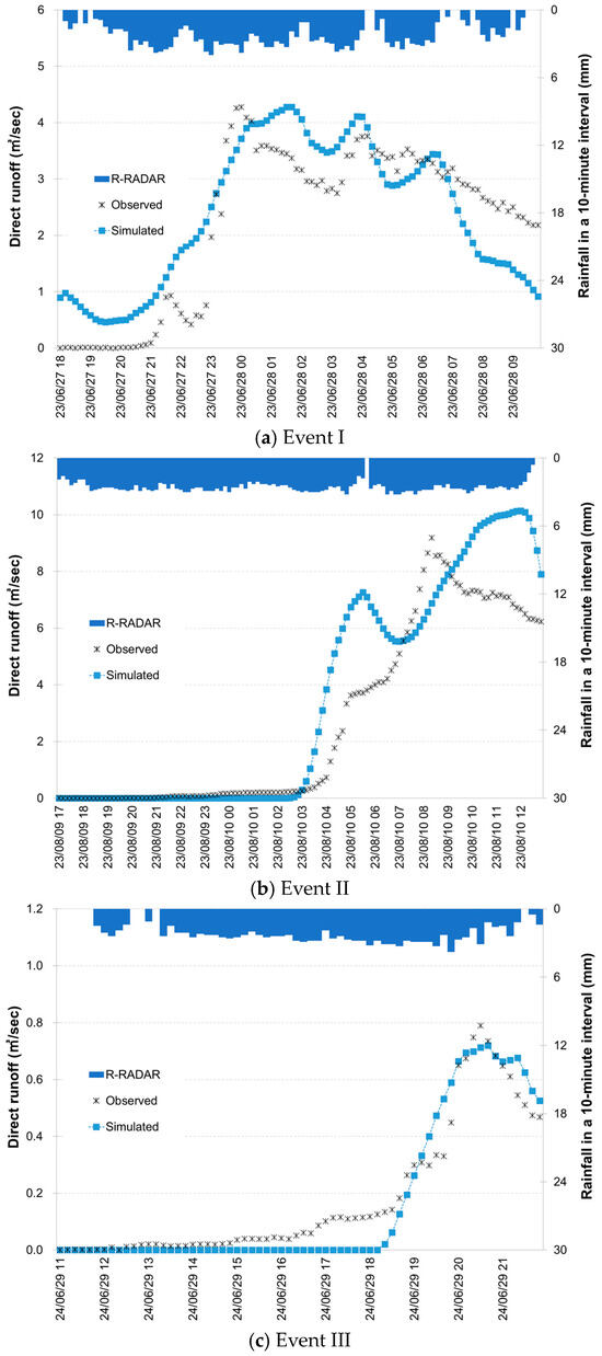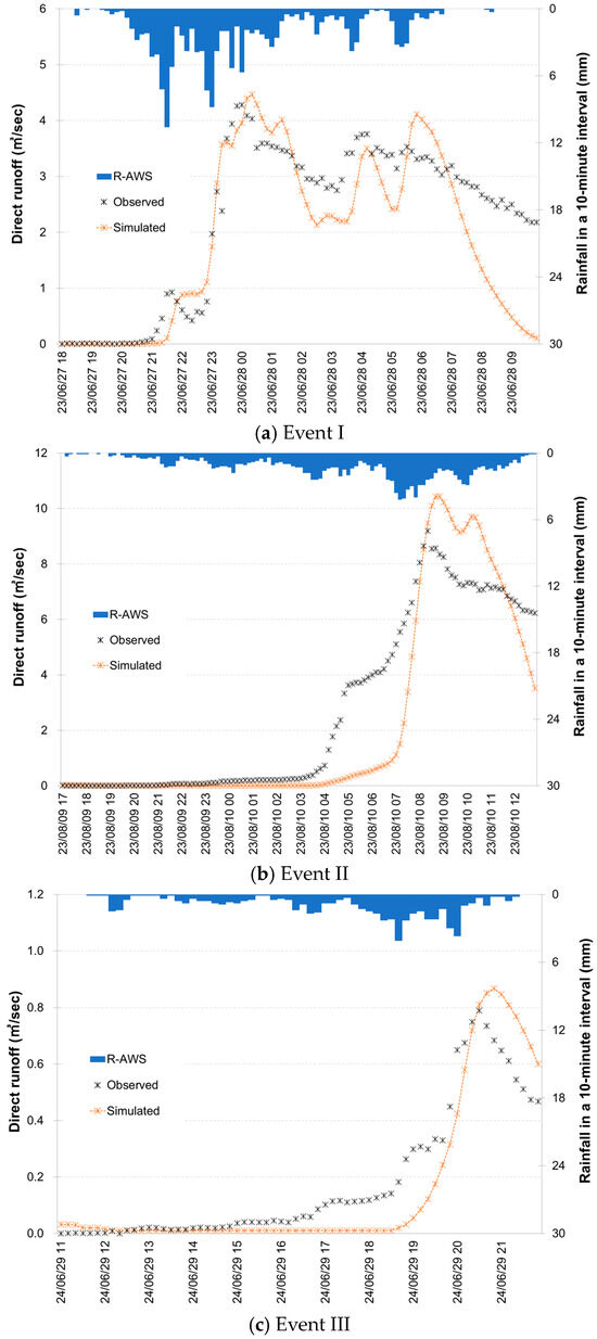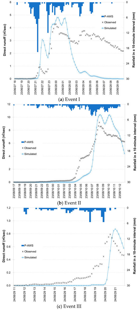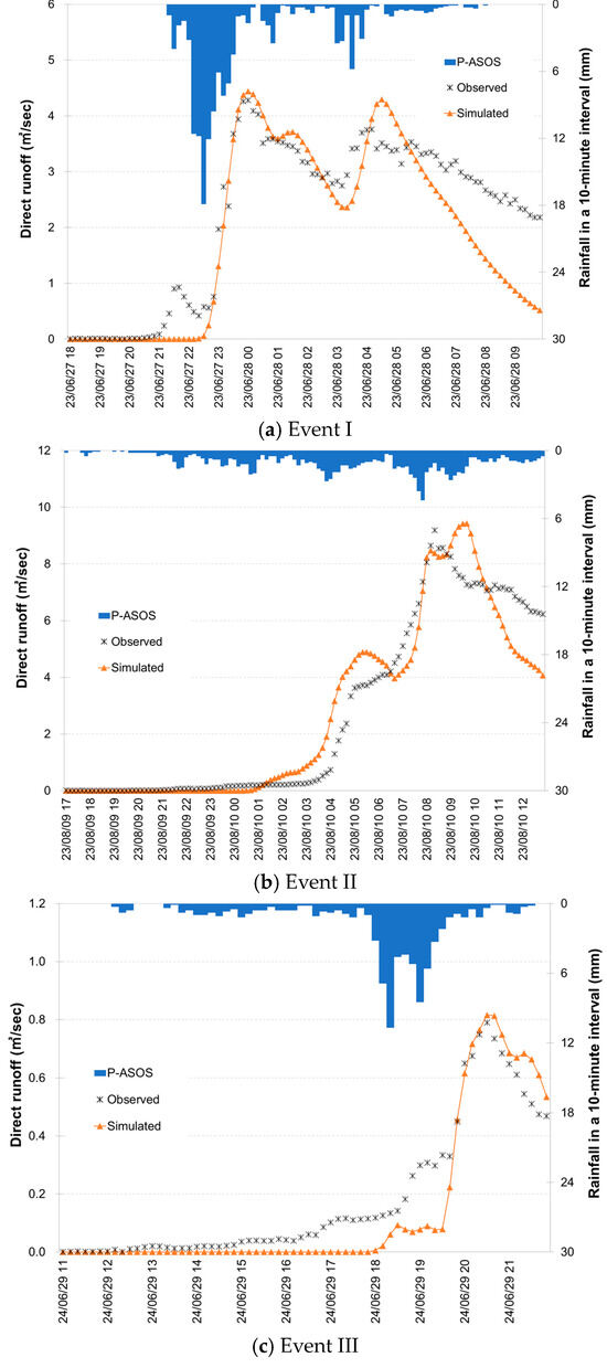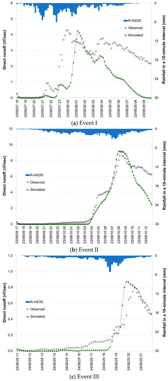 Rainfall events for testing were selected considering the availability of rainfall and runoff measurement data from the on-site AWS, as well as the presence of rainfall observations at ASOS (192) and AWS (907). The chosen events were 27 June 2023 (Event I), 9 August 2023 (Event II), and 29 June 2024 (Event III). Considering the variation in the start and end times of rainfall events across the observation stations, the time range for each event was standardized, as detailed in Table 1, to facilitate a consistent comparison of rainfall input data and ensure uniform temporal conditions for runoff simulation.