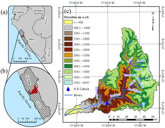 Geographical map of the Pativilca River Basin (a) study area in Peru; (b) study area in Ancash and Lima regions; (c) study area with elevation and rivers in the basin.