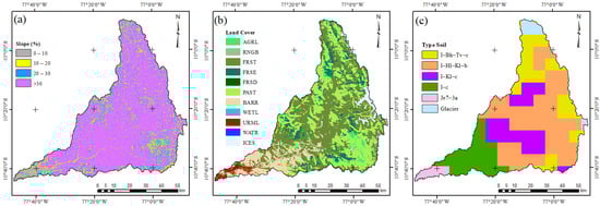 Spatial distribution of slope, land cover, and type soil in the Pativilca Basin. (a) Shows how the slope changes, with steeper areas mostly up in the upper part of the basin; (b) maps out the land cover, including vegetation, farms, and urban spots; and (c) highlights the soil types, showing how they affect water retention and erosion throughout the basin.