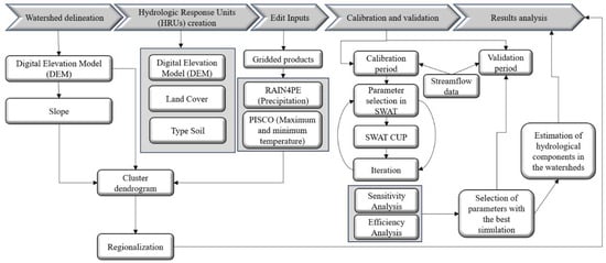 Figure 3 illustrates the flowchart for hydrological modeling, starting with watershed delineation using a Digital Elevation Model (DEM) and slope analysis to define the watershed boundaries. Next, Hydrologic Response Units (HRUs) are created using DEM, land cover, and soil type data to characterize distinct hydrological regions. Gridded meteorological inputs, such as RAIN4PE (precipitation) and PISCO (temperature), are then incorporated. The process continues with calibration and validation, where the SWAT model is calibrated using streamflow data, iterating through parameter sets in SWAT-CUP with sensitivity and efficiency analyses to optimize the simulation. Once calibrated, the model is validated with separate data to assess accuracy. Finally, the validated model is used to estimate hydrological components of the watersheds. Throughout the flowchart, regionalization and cluster analysis using a dendrogram ensure consistent parameter selection and simulation across different regions. The process emphasizes iterative refinement to achieve precise hydrological predictions. Watersheds were grouped using a dendrogram clustering method, considering factors such as elevation, slope, precipitation, and maximum and minimum temperatures. This approach enables grouping similar watersheds, facilitating a more accurate and comprehensive analysis.
