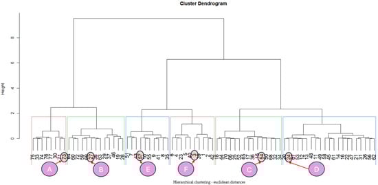 Cluster dendrogram for the regionalization of catchments in the Pativilca Basin. The dendrogram delineates six distinct catchment groups (A–F), represented by color-coded branches. Each group’s representative catchment is highlighted in pink. The vertical axis reflects the degree of dissimilarity between the catchments, with greater heights indicating higher dissimilarity. This regionalization was achieved using hierarchical clustering based on Euclidean distances, facilitating the identification of hydrologically similar catchment groups for further analysis.