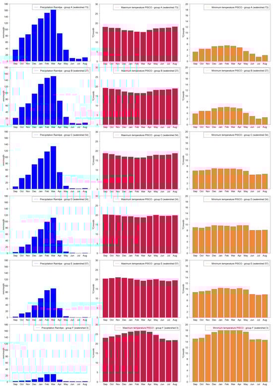 Seasonal variations in precipitation, maximum, and minimum temperatures in the Pativilca Basin regions. The first column (blue bars) represents monthly precipitation, while red bars indicate maximum temperatures and orange bars depict minimum temperatures. The groups are arranged vertically from top to bottom, starting with Group A at the uppermost position and concluding with Group F at the lowest. These graphs highlight the temporal distribution and variability in key climatic variables across different seasons, enabling the assessment of seasonal trends and their impact on hydrological processes in the basin.