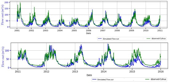The calibration (2000–2010) and validation (2011–2015) of the Pativilca watershed using the SWAT hydrological model, conducted on a daily time step, yielded robust statistical metrics indicative of model performance. The NSE values were 0.69 and 0.72 for the calibration and validation periods, respectively, demonstrating satisfactory predictive capability with a good performance []. The R2 was 0.84 during the calibration and slightly lower at 0.82 during the validation, reflecting strong agreement between the observed and simulated daily flows, demonstrating a very good performance []. The PBIAS was −28.01% for the calibration and −22.51% for the validation, indicating a tendency for the model to underestimate the streamflow, particularly in the calibration phase, with a satisfactory performance []. The RSR was consistent at 0.54 for both periods, suggesting a moderate level of residual variance. The KGE improved from 0.60 during the calibration to 0.69 in the validation, underscoring the enhanced model reliability over time and validating the SWAT model’s applicability to the Pativilca watershed (Table 4; Figure 7).