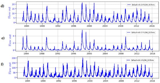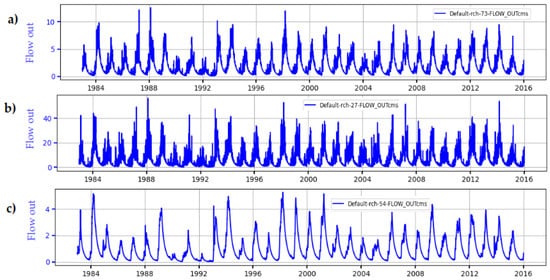 The analysis of the estimated daily flows between 1981 and 2015 for the representative watersheds of the Pativilca Basin reveals a marked seasonality pattern, with peaks recorded during the wet months (January to March) and lows during the dry months (June to September). In Group A, represented by watershed 73, the average daily flow reaches its maximum in March with 4.77 m3/s and decreases to 0.59 m3/s in September, reflecting the direct influence of seasonal precipitation in higher-altitude areas; this group shows a daily flow range from 1.00 to 12.00 m3/s (Figure 9a). Group B, corresponding to sub-watershed 27, exhibits higher flows with a maximum average of 16.53 m3/s in March and a minimum of 1.65 m3/s in August, indicating a greater capacity for water capture and storage at intermediate elevations, with a daily flow range from 1.74 to 52.70 m3/s (Figure 9b). Meanwhile, Group C, represented by watershed 54, shows lower flows, with a maximum of 2.51 m3/s in March and a minimum of 0.25 m3/s in October, reflecting a more limited storage capacity and significant dependence on seasonal precipitation; its daily flow varies between 0.15 and 5.28 m3/s (Figure 9c). Group D, represented by watershed 24, exhibits significant seasonal variation, with a maximum of 8.79 m3/s in March and a minimum of 0.86 m3/s in October, with a daily flow range from 0.95 to 21.80 m3/s, underscoring the importance of precipitation in maintaining flow (Figure 9d). In Group E, watershed 57 has the lowest daily flows, with a maximum of 1.30 m3/s in March and a minimum of 0.07 m3/s in October, denoting a limited storage capacity and high dependence on upstream contributions, with a range from 0.07 to 5.66 m3/s (Figure 9e). Finally, Group F, whose watersheds are located in the lower part of the Pativilca Basin, records the highest average daily flows, reaching 77.36 m3/s in March and decreasing to 7.75 m3/s in September, with a wide variability between 10.20 and 205 m3/s (Figure 9f), reflecting its crucial role as a discharge zone that receives and redistributes water from the upper watersheds. This analysis highlights the hydrological diversity within the Pativilca Basin, influenced by the altitude, storage capacity, and connectivity between the watersheds, with the wet months significantly contributing to the flow peaks, while, during the dry months, the watersheds rely on the redistribution of water from higher elevations.
