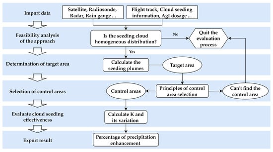 The effectiveness of cloud seeding includes direct effects, which refer to changes in cloud macro or micro parameters, and indirect effects, which refer to changes in surface precipitation. Many approaches and methodologies have been utilized to evaluate the cloud seeding effect, but quantitative and universal research is rare. Randomized statistical test was a common method in previous studies, but currently, most quantitative evaluations are achieved by numerical simulations. Recent studies have proposed a physical test evaluation approach based on a radar rainfall estimation algorithm [,], but it is mostly employed for typical cases that cannot be widely used. In this study, we propose a composite evaluation approach by analyzing two operational aircraft cloud seeding cases in stratus clouds. It mainly focuses on comparing the variation of physical parameters in TA and CA. The only difference is the physical parameters adopted in them. The first is radar reflectivity, and the second is hourly precipitation. Both of them have advantages and disadvantages. For example, as one of the direct effects, radar echo variation caused by cloud seeding is much easier observed and illustrated than that of surface precipitation, which is regarded as the indirect effect. In addition, radar data commonly have higher temporal resolution than rain gauge data. However, precipitation is an in situ observation and utilizing the quantitative variation of rainfall as a cloud seeding effect present to the public is more intuitive. This approach proposed by this study can be applied to qualitative analysis in a single aircraft cloud seeding operation and can also provide quantitative statistical results from multiple cloud seeding cases.