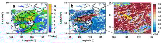 Spatial distribution of CTH (a) and COT (b,c) from Himawari-8 retrievals at 03:00 on 4 March 2018 (case 1). The solid line in the rectangles indicates the operational flight track.