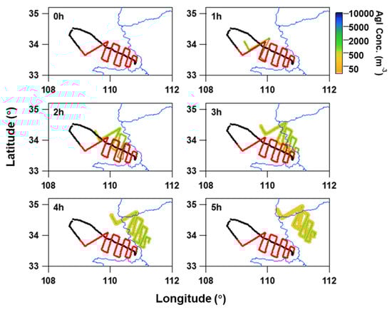 Hourly distribution of AgI plumes since cloud seeding initiation in case 1 (0~5 h). The airborne cloud seeding was initiated at 03:30 UTC and lasted ~150 min. The red line indicates the seeded flight track, and the colored curve is the calculated AgI plume per hour since cloud seeding initiation.