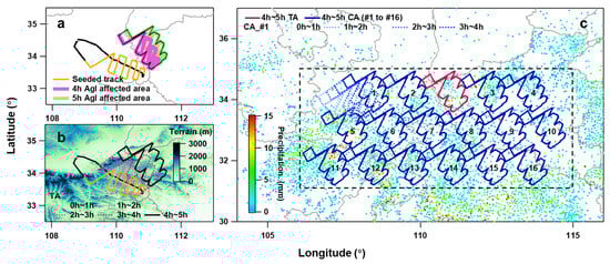 The TA illustrated by the fourth and fifth hours of AgI plumes (a) and the cumulative TA of every hour obtained by analogy (b). 5-h cumulative precipitation distribution, and the location of TA and 16 CA determined in case 1 (c). The orange line in (a,b) indicates the seeded flight track. The terrain in the vicinity of the cloud seeding region is also shown in (b). There are 2730 rain gauges homogeneously distributed in TA and CAs (refer to the dotted rectangle in (c), 106~115° E, 31~35° N).