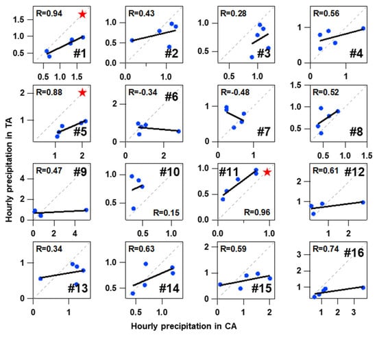 The correlation relationship between the TA and 16 CAs calculated by hourly precipitation in case 1. Red stars indicate the correlation coefficient (R) > 0.8.