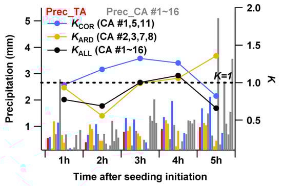 To discuss the impact of different CA selections on the final evaluation results, we calculate the hourly ratio of surface precipitation in TA to that in (a) the regions with better relevance (CACOR, corresponding to CA_#1, CA_#5, and CA_#11), (b) the regions in the vicinity of TA (CAARD, corresponding to CA_#2, CA_#3, CA_#7, and CA_#8), (c) all sixteen regions (CAALL, corresponding to CA_#1~16). Here, we define the ratio as KCOR, KARD, and KALL according to Equation (2), respectively. As the 16 regions contain most of the areas covered by this precipitation, it can roughly present a natural precipitation change (or considered as the background variation of precipitation) around the TA. Then, the ratio of precipitation in the TA to that in different CAs can be approximately regarded as the operational cloud seeding effect. Therefore, the effect can be qualitatively evaluated through K value vary analysis (Figure 8). Taking all 16 regions as CAs for comparison, KALL = 0.86 since cloud seeding initiation, and increased until the fourth hour and then decreased. Hourly rainfall in TA is greater than that in CA (from KALL > 1) during the third and fourth hour since cloud seeding initiation, indicating that a possible cloud seeding effect may appear in this period. If CA was delimited according to the correlation of hourly rainfall (such as CACOR), KCOR = 0.97 initially, and increased first and then decreased. Rainfall in the TA is approximately the same as that in the CA at the first hour since cloud seeding initiation. Considering the AgI agent involved in the nucleation of ice crystals to generate surface precipitation by a series of physical processes, therefore, precipitation changes in the first hour near the beginning of cloud seeding can be approximately regarded as a nature background. The first hour K value is considered to reflect a background rainfall difference.