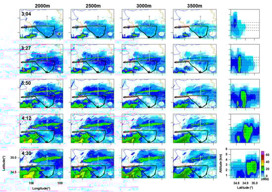 The radar constant altitude plan position indicator (CAPPI) from 2000 m to 3500 m with a 500 m interval at 3:04, 3:27, 3:50, 4:12, and 4:30 UTC was selected to show the evolutional seeded echo by using radar grid data (Figure 9). Quality control and data gridding were performed to ensure radar reflectivity spatial and temporal consistency [,]. As seen from Figure 9, a clear cloud seeding signature with reflectivity of 10~20 dBZ was initially recognized at 3:04 UTC on 3000~3500 m, then gradually extended as the AgI dispersed. The vertical cross-section (VCS) along the gray line in Figure 9 shows the seeded radar echo strong-developing vertically. The seeded echo then reached the surface at 3:27 UTC with a relatively homogeneous vertical distribution from ground to echo top. To better understand the cloud seeding effect by radar data, we take the 3000 m CAPPI and VCS of seeded echo, for instance, to track the seeding signature horizontally and vertically. The seeded echo moved with the prevailing wind and spatial extending accompanied by a background reflectivity increase (Figure S3c). Excluding background effects, it only takes ~22 min (at 03:04 UTC) for the reflectivity of seeded echo to increase from ~0 dBZ to ~20 dBZ. The width of seeded echo (>15 dBz) expended to ~15 km at 04:47 UTC. The seeded echo continued to move ~100 km to the northeast, and its width expanded to ~15 km at 04:47 UTC, then weakened and dissipated after 06:35 UTC [].
