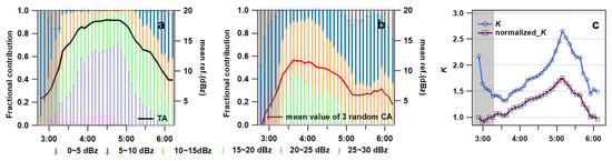 The area of AgI plumes in two consecutive moments is defined as cloud seeding TA (see the preceding in Section 3.1) in this case study. For example, the outer edge enclosed by TA of 03:47 and 03:53 UTC is shown as cumulative TA in Figure 10. We calculated a time series of 3000 m averaged CAPPI and obtained the fractional contribution of every 5 dBz (from 0 to 30 dBz) to the total reflectivity in each TA (Figure 11a). CA was chosen randomly for comparison in the vicinity of TA (see the CA selection principles in Section 2.2.3; the minimal distance of a random CA to the TA is 10 km), and the parameters were calculated in the same method (Figure 11b). The time series of the TA mean reflectivity comparatively completely depicted the life history of seeded echo, which lasted at least for ~3.5 h. Despite the enhancement of echo reflectivity obtained in CA, this phenomenon is more pronounced in the TA. The mean reflectivity >20 dBz in the TA once exceeded 60%, which is rare in CAs. A similar conclusion can also be drawn from K variation and normalized K (to avoid background difference, we normalized the initiate K to 1), which was calculated by Equation (2).