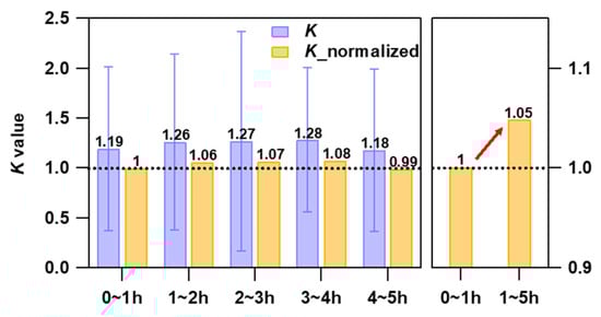 Averaged hourly K and normalized K variation of 20 operational aircraft cloud seeding cases discussed in this study (left panel). The right panel shows the increment of normalized K from the first hour to 2~5 h since cloud seeding initiation.