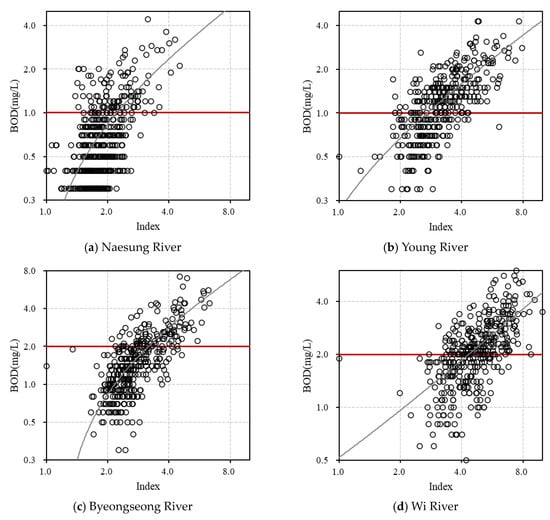 To capture the impacts of environmental drought on water quality, the selected parameters informed the index range and served as indicators of water quality deterioration. Given that BOD is a key regulatory standard for river water quality in Korea, this study focused on BOD as an index parameter. The index for BOD was calculated using the NSF WQI formula, with specific calculation factors and weights established as proposed in this study. This approach allowed us to present an index capable of detecting water quality changes due to environmental drought.