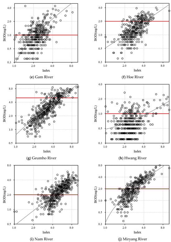 The environmental drought index was calculated by applying weights specific to each basin. The weighted values were incorporated into the index, which was then normalized to a scale of 1 to 10. To evaluate the index’s applicability, the relationship between the calculated index values and BOD concentrations is displayed in Figure 2, with the index values on the x-axis and BOD concentrations on the y-axis (in log scale). This visualization allowed us to assess the index’s relevance for real rivers by examining its relationship with BOD. Class intervals were established using the Ministry of Environment’s target water quality standards for each basin. Additionally, applicability was quantitatively assessed through the R2 and correlation coefficients (Table 2). The correlation coefficient ranged from 0.46 to 0.86, while the coefficient of determination (R2) ranged from 0.1 to 0.77, with values under dry and low-flow conditions ranging from 0.06 to 0.84. These results indicate that the environmental drought index calculation method presented in this study is broadly applicable. However, the applicability was lower in the Hwang River, where the water quality remained low and showed minimal response to flow rate and weather variability. The index calculation results revealed areas with significant drought impact and others, like the Hwang River, where hydrological variability had a limited effect on water quality. This index calculation method successfully distinguished between areas with high and low susceptibility to drought impacts.