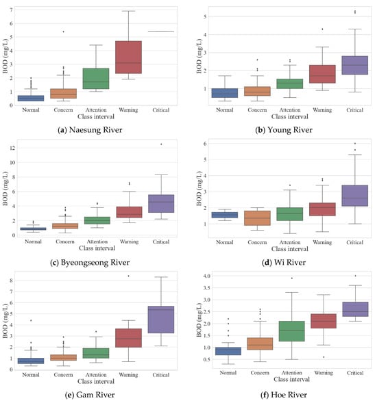 The standardized precipitation index (SPI), a meteorological drought index, classifies conditions as Extremely Wet, Severely Wet, Moderately Wet, Mild Wet, Mild Drought, Moderate Drought, Severe Drought, and Extreme Drought based on index values, providing an assessment of drought and wetness relative to precipitation levels. The Water Quality Index (WQI), in contrast, categorizes water quality as Excellent, Good, Medium, Bad, and Very Bad, indicating overall water quality status. The water quality and environmental drought index developed in this study aims to assess river water quality under drought conditions, differentiating itself from the SPI’s focus on meteorological wetness and drought and the WQI’s general water quality assessment. Instead, it seeks to identify water quality risk levels associated with hydrological variability. To standardize its application across different rivers, the index class intervals were set to a consistent range, ensuring usability. Thresholds for each interval were determined using BOD target water quality values for each river, as shown in Figure 2. In this figure, the red line represents the BOD target water quality, and the class intervals were defined by whether the index exceeded this target. Five classification levels were established: Normal, Concern, Attention, Warning, and Critical, to reflect water quality risk related to meteorological and hydrological changes (Table 3).