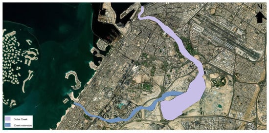 One example of this is Dubai Creek, where recent large-scale infrastructure projects have altered water circulation patterns and introduced new water quality challenges. Dubai Creek, originally a 14 km long artificial seawater channel, has been extended as part of a 2016 project, connecting the creek to the Arabian Gulf from a second inlet and increasing its length to approximately 24 km, with an average width of 300 m [2]. This extension, in addition to the rapid urbanization along its banks, has increased pollution risks, highlighting the need for proactive environmental planning and comprehensive water quality assessments to ensure long-term sustainability. Figure 1 illustrates the original path of Dubai Creek, along with the new extension, showcasing the scale of the modifications.