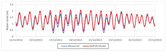 Figure 6 shows a graph of the water-level comparison between the measured and modeled data at the Al Mamzar tide gauge in the Old Creek model. The graph shows a two-week representation of the simulated period, between 13 and 27 December 2013. The graph presented shows a strong correlation between the measured and modeled data at the Al Mamzar tide gauge for the two models. The minimum and maximum measured water levels at the tide gauge are 0.3 and 2.0 m, respectively. From the modeled data, the minimum and maximum modeled water levels are 0.4 and 2.0 m, respectively. This indicates a strong agreement between the observed data and the model predictions.