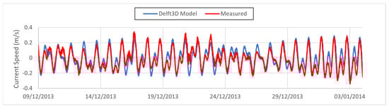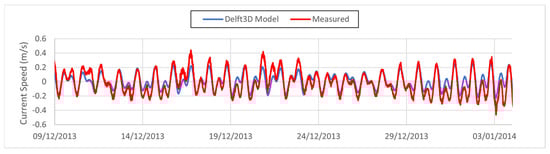 The current speed and direction measured at the ADCP were used to calibrate the hydrodynamic model. Figure 8 and Figure 9 present graphs showing the measured x and y components of the current speed, respectively, against the Delft3D model data for the period from 9 December 2013 to 3 January 2014. The graphs suggest a strong correlation between the measured and the model current velocities, which are 0.85 and 0.83 for the x and y components, respectively. Additionally, Root Mean Square Error (RMSE) and bias were calculated to better understand how close the measured and model data were to each other. Lower values of RMSE and bias indicate better agreement between the data sets. The calculated RMSE and bias for the x component of the current speed are 0.09 and 0.03 m/s, respectively. Similarly, the calculated RMSE and bias for the y component of the current speed are 0.08 and 0.02 m/s, respectively. The calculated RMSE and bias indicate that the measured and model data are in a high level of agreement. In other words, the strong alignment between the data gathered through observation and the predictions generated by the model implies a high degree of accuracy and reliability in the model’s simulation of real-world conditions.