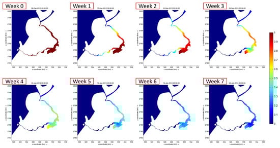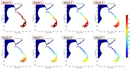 The Old Creek has one opening to the open sea and extends around 14 km downstream at Ras Al Khor Wildlife Sanctuary. Hence, the insufficient water circulation in the Old Creek suggests that the flushing might seem to be poor, as suggested in previous research [20]. The flushing model of the Old Creek was run for a period of 53 days, which translates to around 7 weeks. Figure 10 presents the concentration of the introduced conservative tracer along the Old Creek flushing model at a time step of 1 week. The model shows the drop in the tracer concentration along the creek as time progresses. The highest drop in concentration was observed towards the opening of the creek. On the other end of the creek, the drop in the tracer concentration is lower as it is further away from the open sea. At the end of the simulation period (7 weeks), the concentration of the tracer in some areas of the creek reached as high as 65% of the initial concentration.