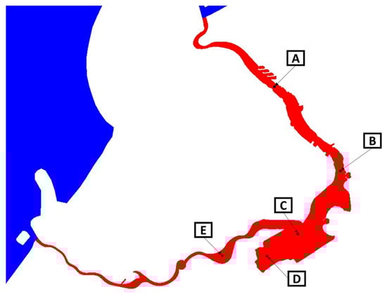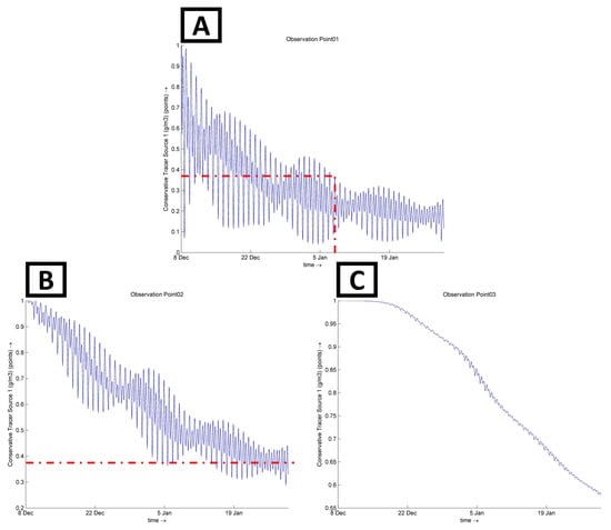Observation points (Points A–C) were placed in the Old Creek flushing model, as shown in Figure 11, to examine the residence times at different locations in the creek. Graphs showing the concentration of the conservative tracer over time at the three observation points are shown in Figure 12. The graph of point “A” shows the highest drop in the tracer concentration and comes after points “B” and “C”. The concentration of the tracer in point “A” reaches the “E-folding” residence time criterion of 37% of the initial concentration in approximately 30 days. However, the concentrations of the tracer in points “B” and “C” do not fall below the 37% criteria during the whole simulation period, which is 53 days. At point “C”, which is the furthest point from the open sea, the concentration of the tracer reaches a minimum of 65% which is considered relatively high. In order to flush the whole creek and reach the “E-folding” residence time criteria, a very long simulation time would be necessary. This indicates poor flushing of the Old Creek model and poor water quality in general. The poor flushing in Old Creek is supported by research conducted in the past on the water quality in Dubai Creek [30,31].