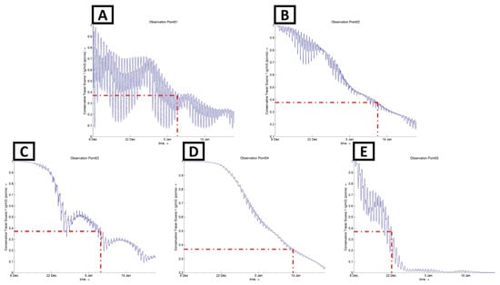 Furthermore, additional observation points were introduced in the Existing Creek model to further analyze the overall flushing of the Creek. Point “D” was placed in the center of the creek as this area seems to be the most critical in terms of flushing. Additionally, point “E” was placed in the extended channel of the creek. The highest residence time was obtained at point “D”, which was around 40 days. On the other hand, point “E” showed the shortest residence time, of around 14 days.