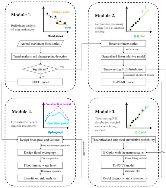 Figure 1 shows the flowchart of non-stationary design flood estimation in the reservoir operation period considering historical information, which comprises four main modules. The first module conducts a preliminary analysis of non-stationarity in the annual maximum flood series by trend analysis and change point detection. The second module constructs the time-varying parameters of P-III distribution with covariates based on the generalized linear additive model and uses the maximum likelihood method to estimate the parameters. In the third module, the Tv-P3/CF model is proposed to estimate design floods in the reservoir operation period. The fourth module derives the design flood hydrograph and analyzes benefits and risks of the TGR.