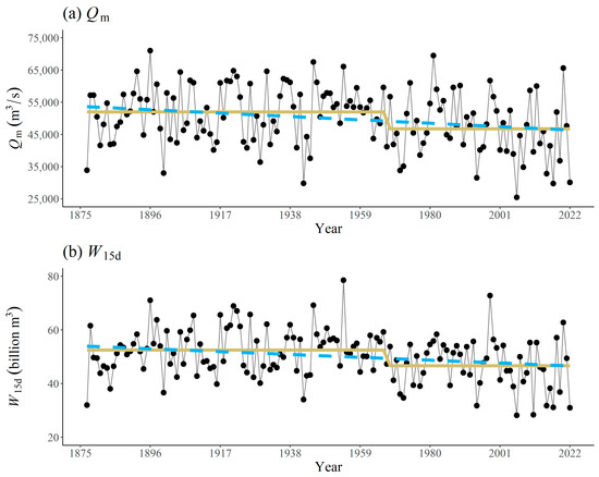 Non-stationarity is the opposite of stationarity, meaning that a non-stationary hydrological series can be understood as one that contains trends, discontinuities, or periodicities. Considering that periodicity typically occurs within a year rather than inter-annually, the preliminary diagnosis of non-stationarity in the annual maximum flood series generally does not include periodicity [20]. This module preliminary analyzes the non-stationarity in the annual maximum flood data series using the Mann–Kendall trend test [50,51,52] and Pettitt’s test [53] for change point detection.