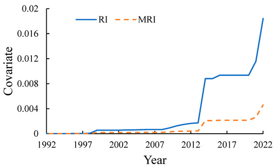 There are various indicators proposed to implicitly measure the impact of reservoir regulation on the downstream flow regime and flood data series. For example, Batalla et al. (2004) quantified the reservoir impact using the ratio of the total reservoir capacity upstream of a hydrological station to the station’s annual average runoff [61]. López and Francés (2013) introduced the reservoir index (RI) based on the drainage area controlled by the reservoir and its regulation capacity [40]. B. Xiong et al. (2019) developed the reservoir–rainfall coupling coefficient based on multi-day antecedent rainfall inputs [62]. The performance of time-varying parameter models varies with different evaluation indicators, which also affects the results of flood frequency analysis. Due to the difficulty of obtaining rainfall data corresponding to historical information and to account for the spatial distribution of upstream reservoirs, the reservoir index (RI) was chosen in this study to measure the impact of reservoirs on the annual maximum flood series, which is expressed as follows: