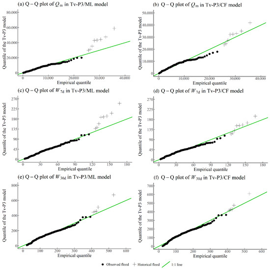 The Q–Q plot (quantile–quantile plot) is a probability plot used to compare two probability distributions by plotting their quantiles against each other [69], which can also be used as a graphical tool for estimating the parameters in a location-scale family of distributions [70]. Then, the Q–Q plot can be utilized to assess the fitness between the empirical frequency and the quantiles of the distribution model, which aids in determining whether the two flood datasets exhibit the same distribution.