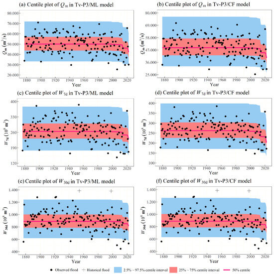 The centile curve plots the centiles for the distributions derived from the time-varying moment model [35,73], which provides a visual assessment of how well the non-continuous flood points align within the estimated percentile ranges of the theoretical time-varying moment model. The calculation formula for the estimated flood variables corresponding to the percentile p is expressed as follows: