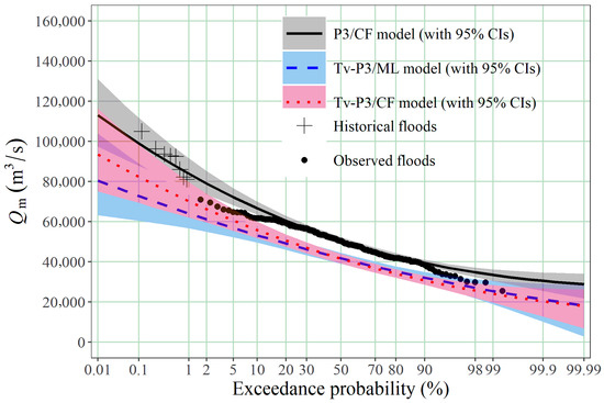 The curve fitting method, recommended by the Ministry of Water Resources in China for parameter estimation of P-III distribution, utilizes the sum of squared deviations (SSD) criterion to minimize the discrepancy between the empirical data and model points [2,57]. As a result, P-III distribution coupled with the curve fitting method (P3/CF model) provides a widely applicable approach for estimating design floods under the stationary assumption.